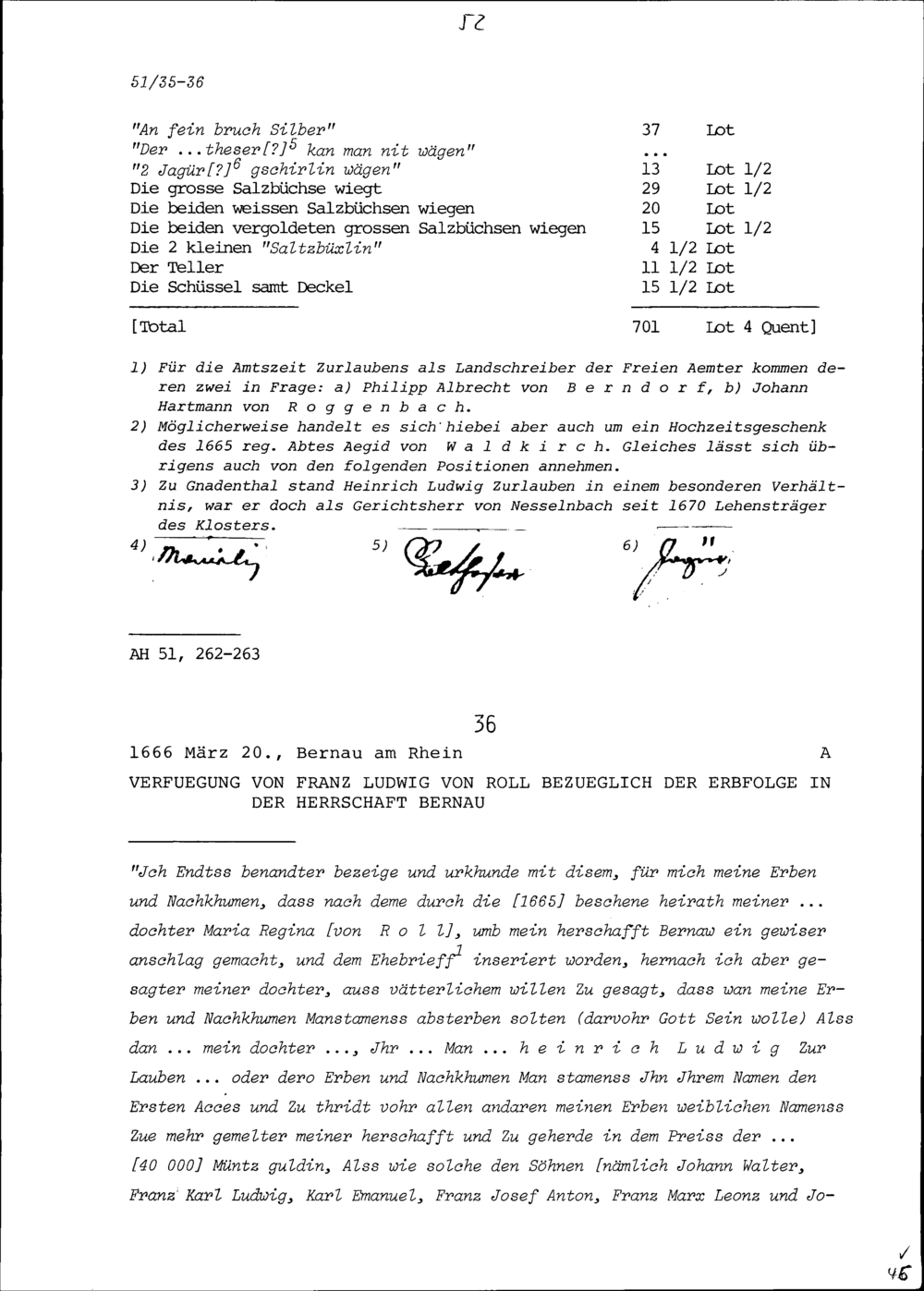Inventar des Silbergeschirrs von Heinrich Ludwig Zurlauben