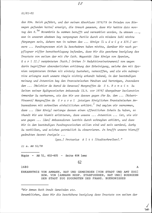 Ratsbeschluss des Schultheiss, Klein- und Grossrats von Freiburg zugunsten des französischen Bündnisses