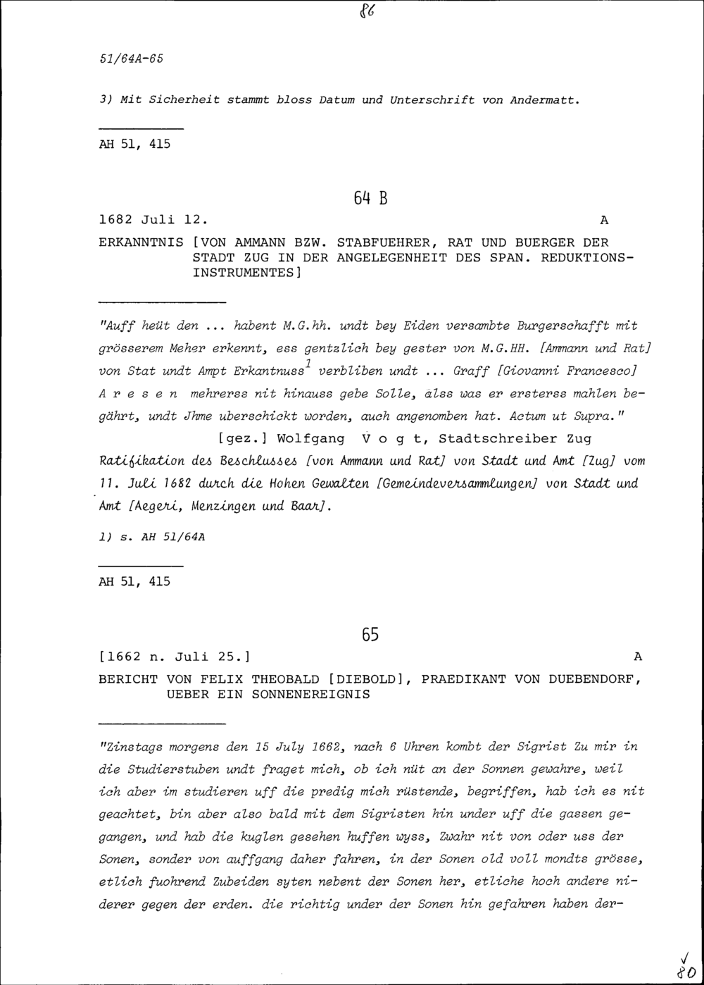 Bericht von Felix Theobald Diebold, Prädikant von Dübendorf, über ein Sonnenereignis