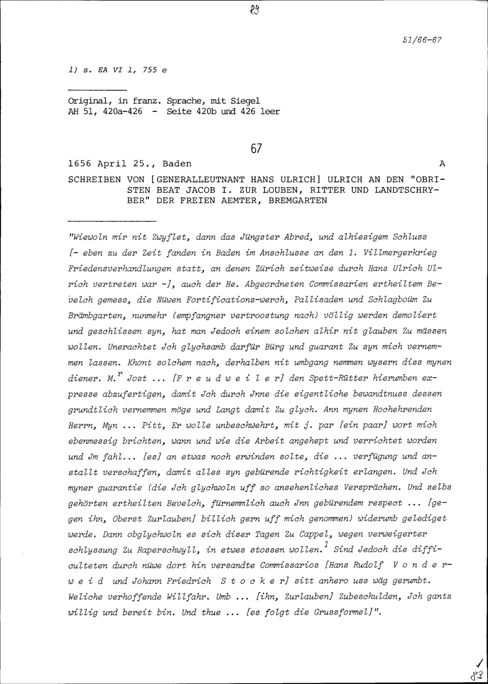 Schreiben von François Mouslier, Resident von Frankreich, an Beat Jakob I. Zurlauben, Statthalter, Zug
