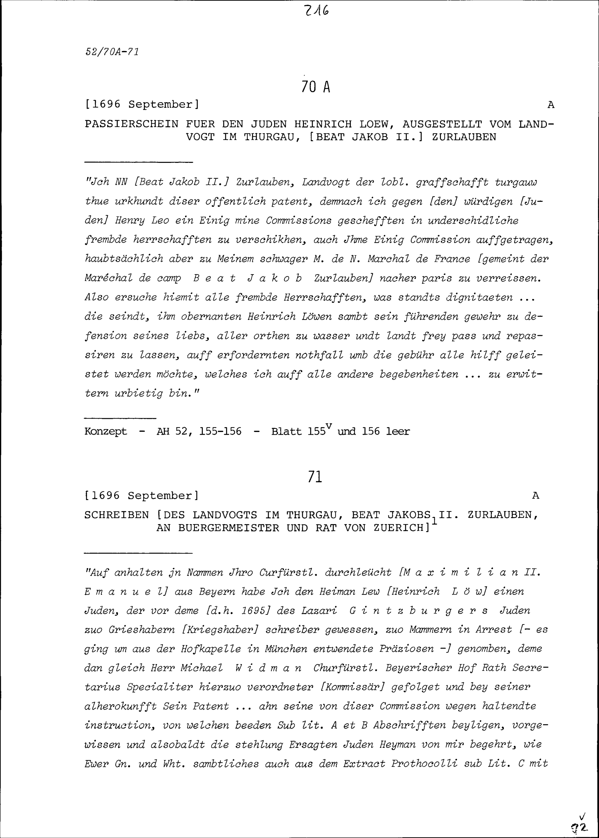 Schreiben von Beat Jakob II. Zurlauben, Landvogt im Thurgau, an Bürgermeister und Rat Zürich