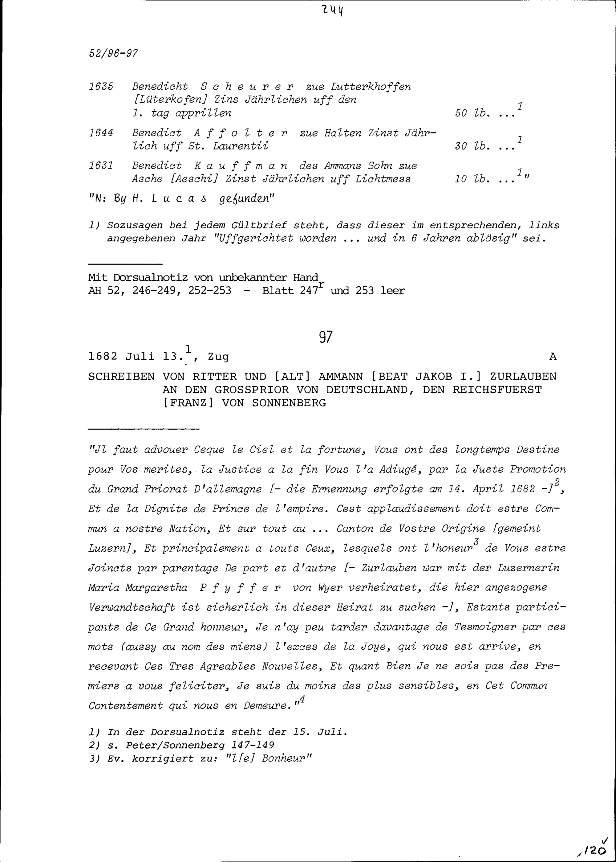 Gültbriefe von Anna Elisabeth Zurlauben, geborene Wallier