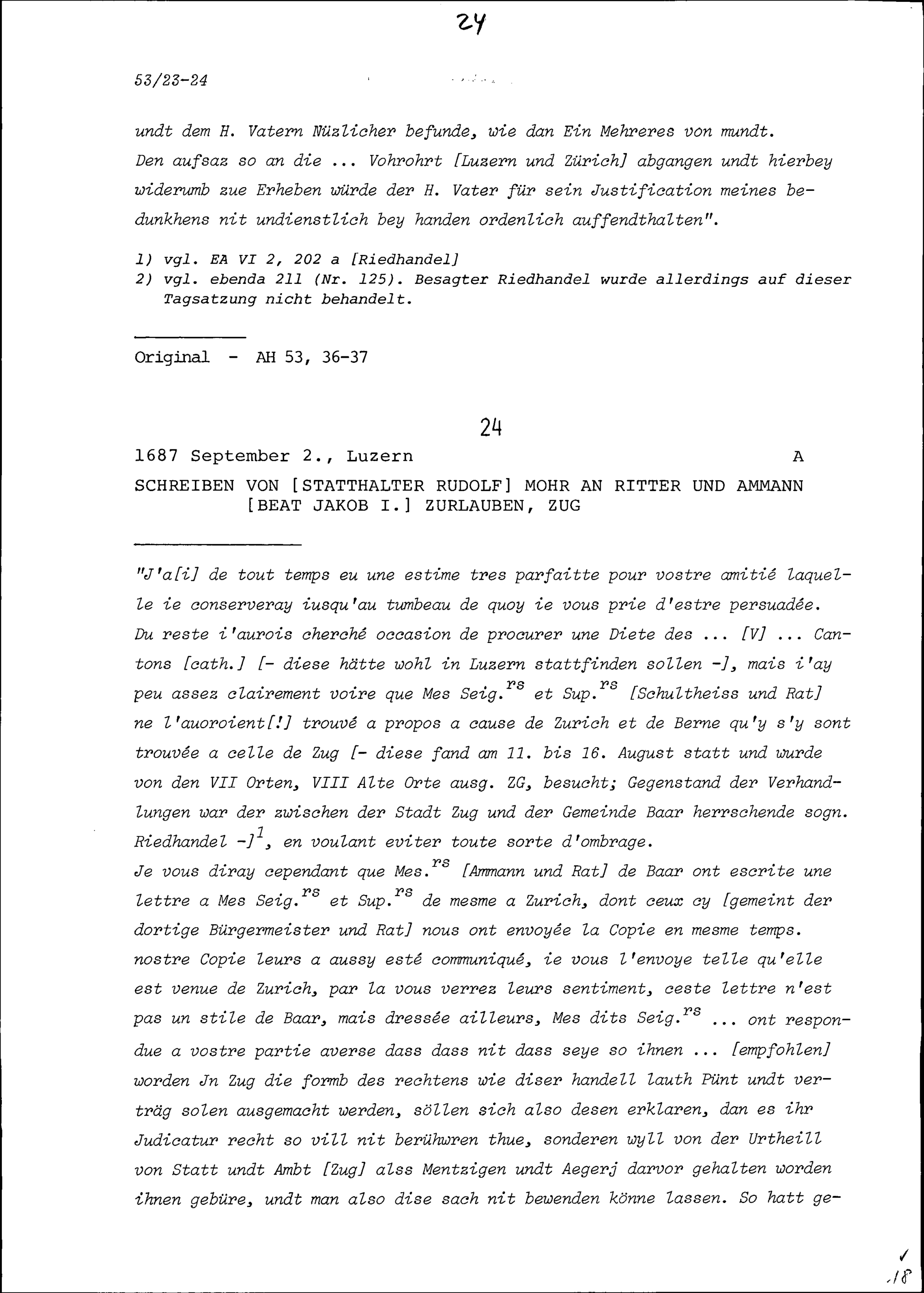 Schreiben von Beat Kaspar Zurlauben, Landschreiber der Freien Ämter, an Beat Jakob I. Zurlauben, Ammann von Stadt und Amt Zug