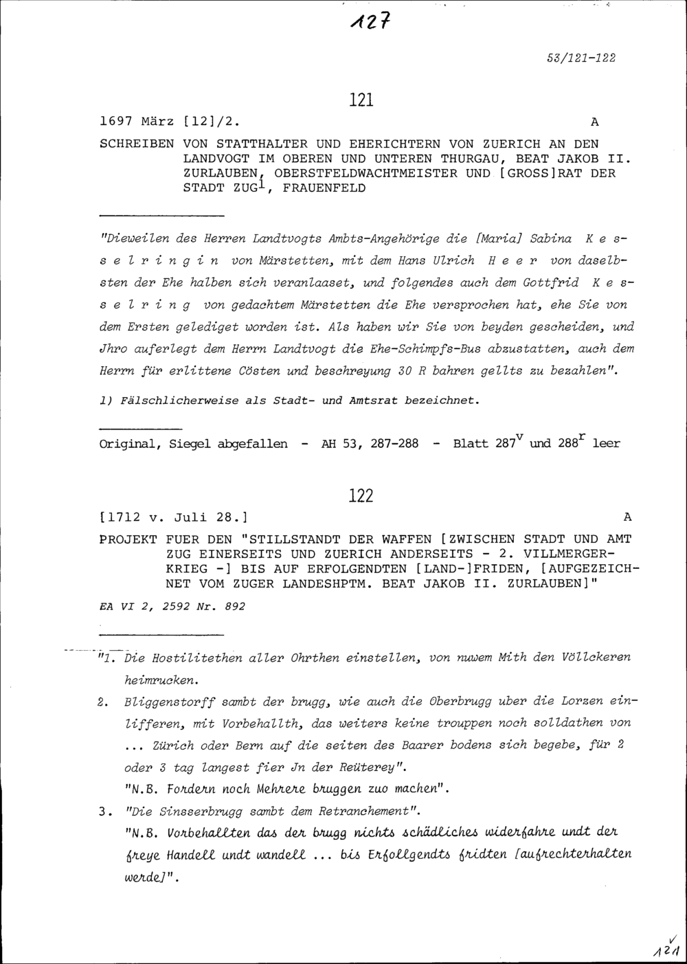 Projekt für Waffenstillstand zwischen Stadt und Amt Zug und Zürich (Zweiter Villmergerkrieg), aufgezeichnet von Beat Jakob II. Zurlauben, Zuger Landeshauptmann