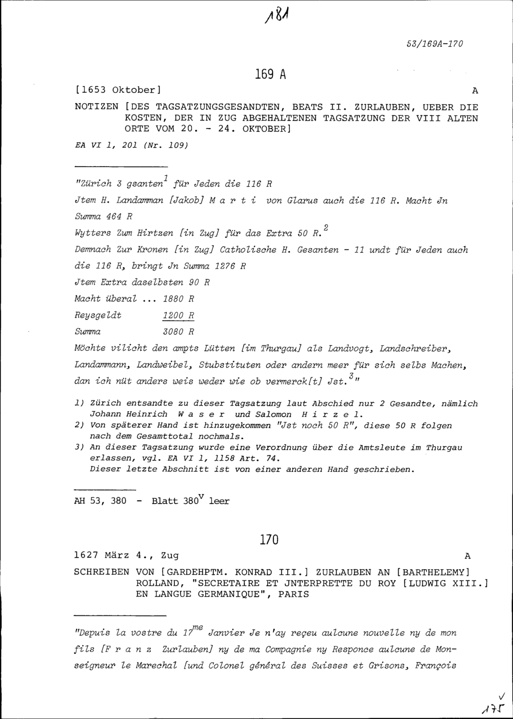 Schreiben von Konrad III. Zurlauben, Gardehauptmann, an Barthélémy Rolland, Dolmetscher von Frankreich