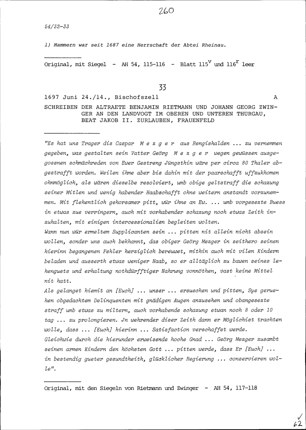 Schreiben von Gerold II. Zurlauben, Abt von Rheinau, an Beat Jakob II. Zurlauben, Landvogt im Thurgau und Major, Frauenfeld