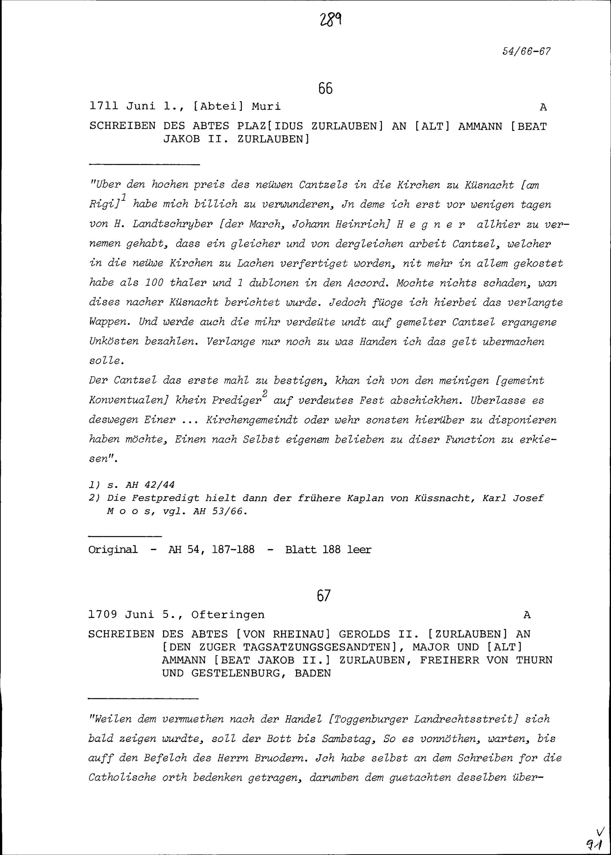 Schreiben von Gerold II. Zurlauben, Abt von Rheinau, an Beat Jakob II. Zurlauben,...