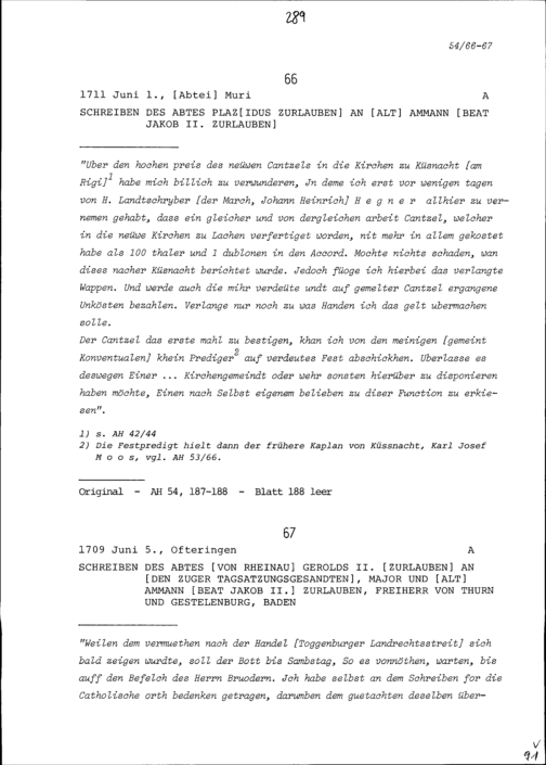 Schreiben von Gerold II. Zurlauben, Abt von Rheinau, an Beat Jakob II. Zurlauben, Tagsatzgungsgesandter, Major und Altammann, Baden