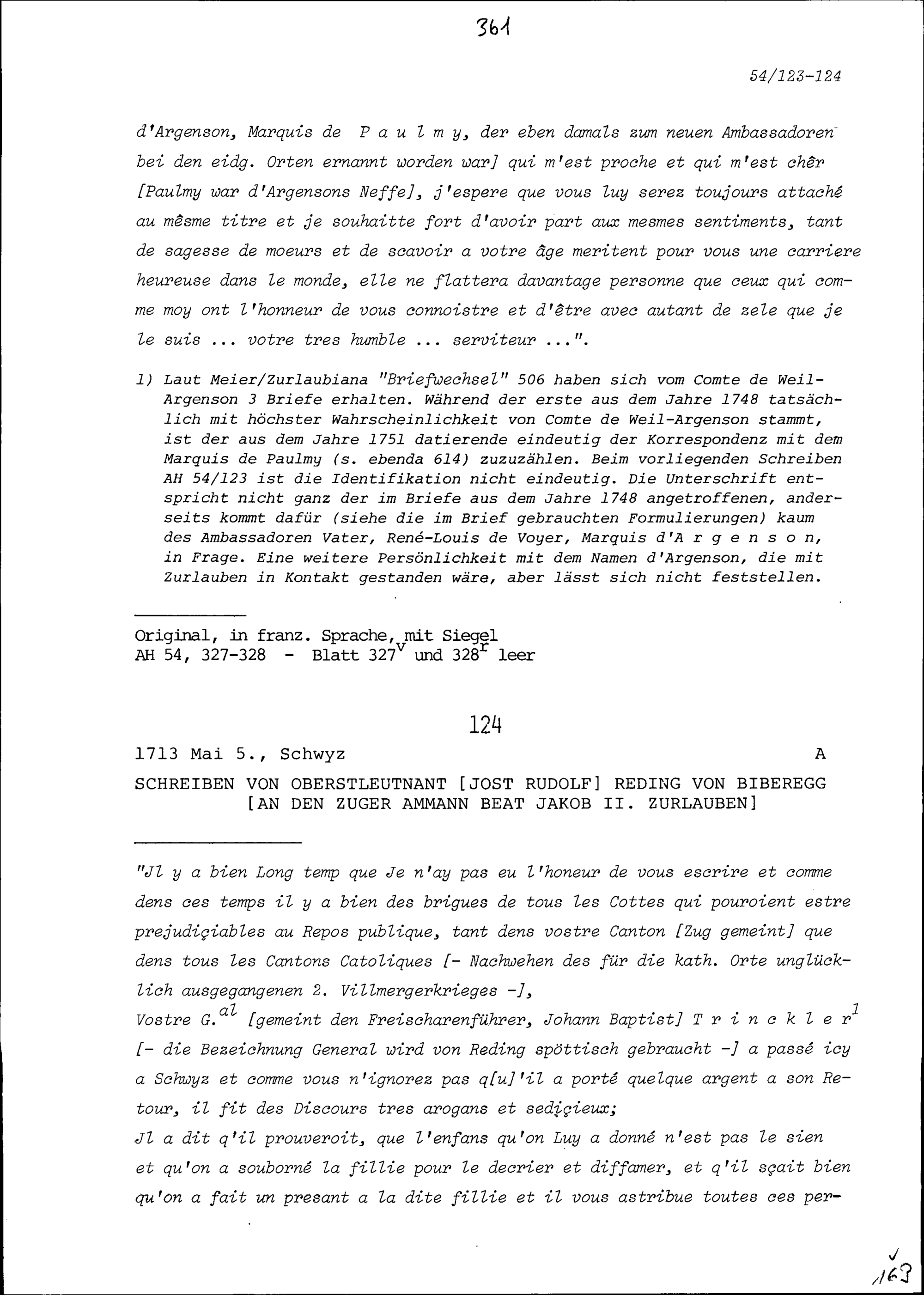 Schreiben von Marc-Pierre de Voyer de Paulmy, Comte de Argenson, französischer Staatskriegsminister, an Beat Fidel Zurlauben, Paris