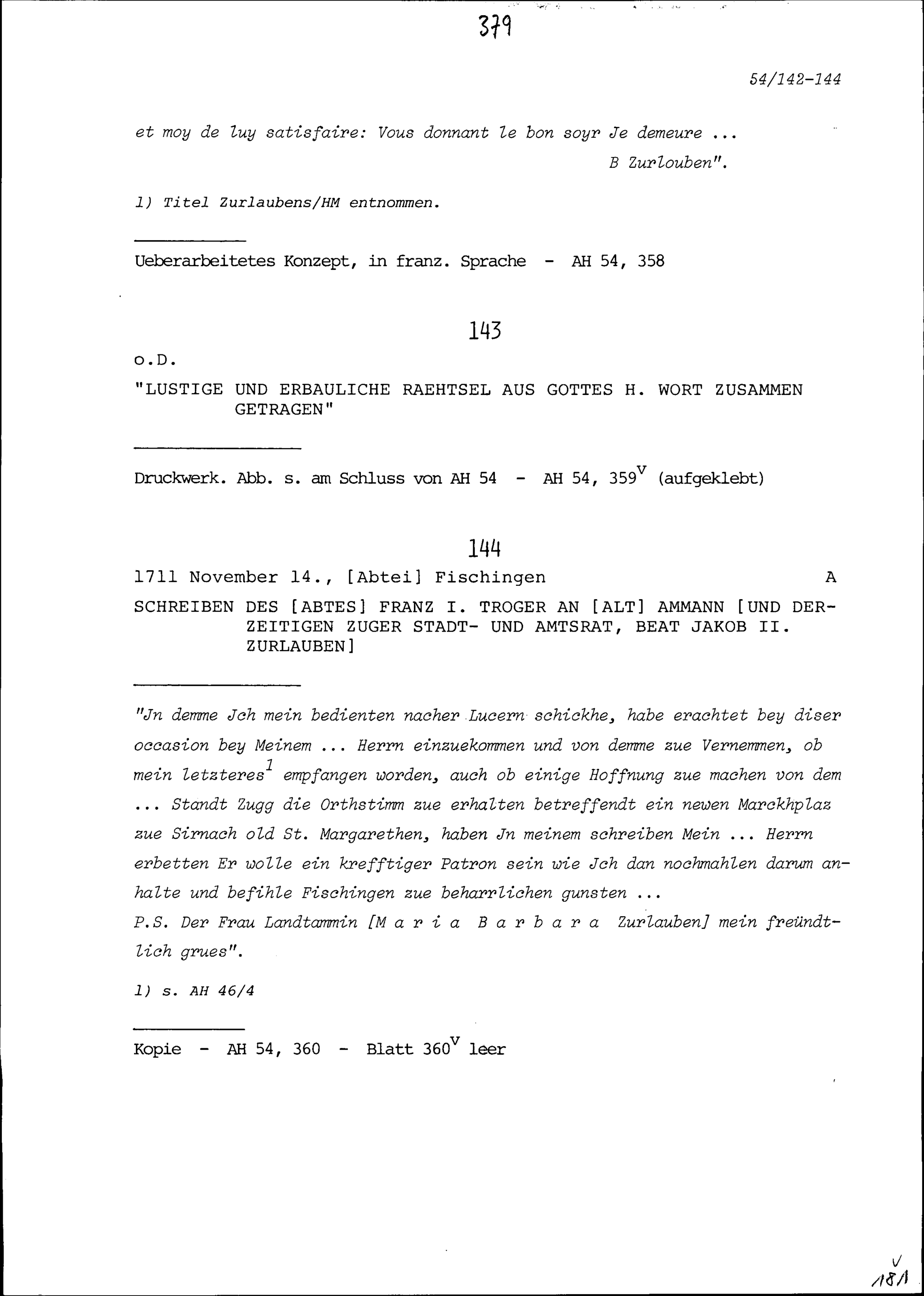 Schreiben von Franz I. Troger, Abt von Fischingen, an Beat Jakob II. Zurlauben, Altammann und Stadt- und Amtrat Zug