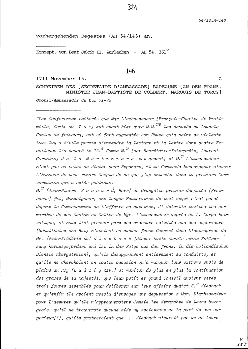 Ansprache von Beat Jakob II. Zurlauben, neue Landvogt in den Freien Ämter, anlässlich seines Aufritts in Villmergen