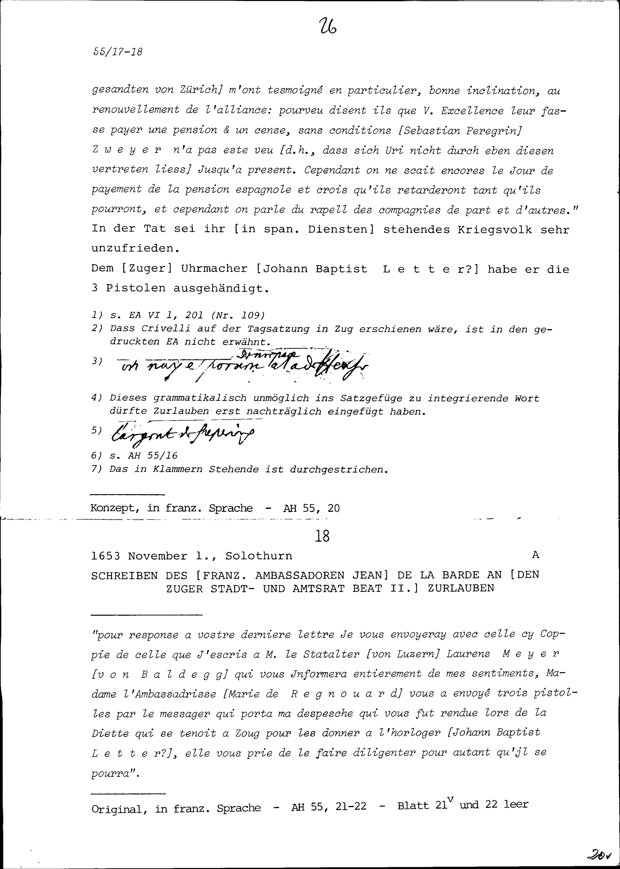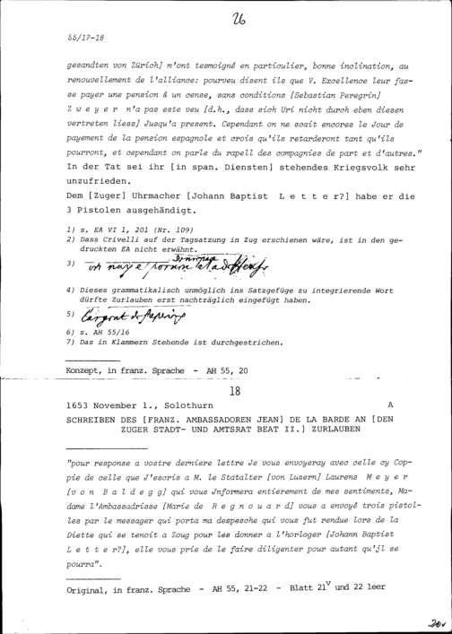 Schreiben von Beat II. Zurlauben, Stadt- und Amtrat Zug, an Jean de la Barde, Ambassador von Frankreich