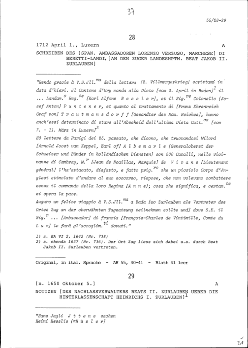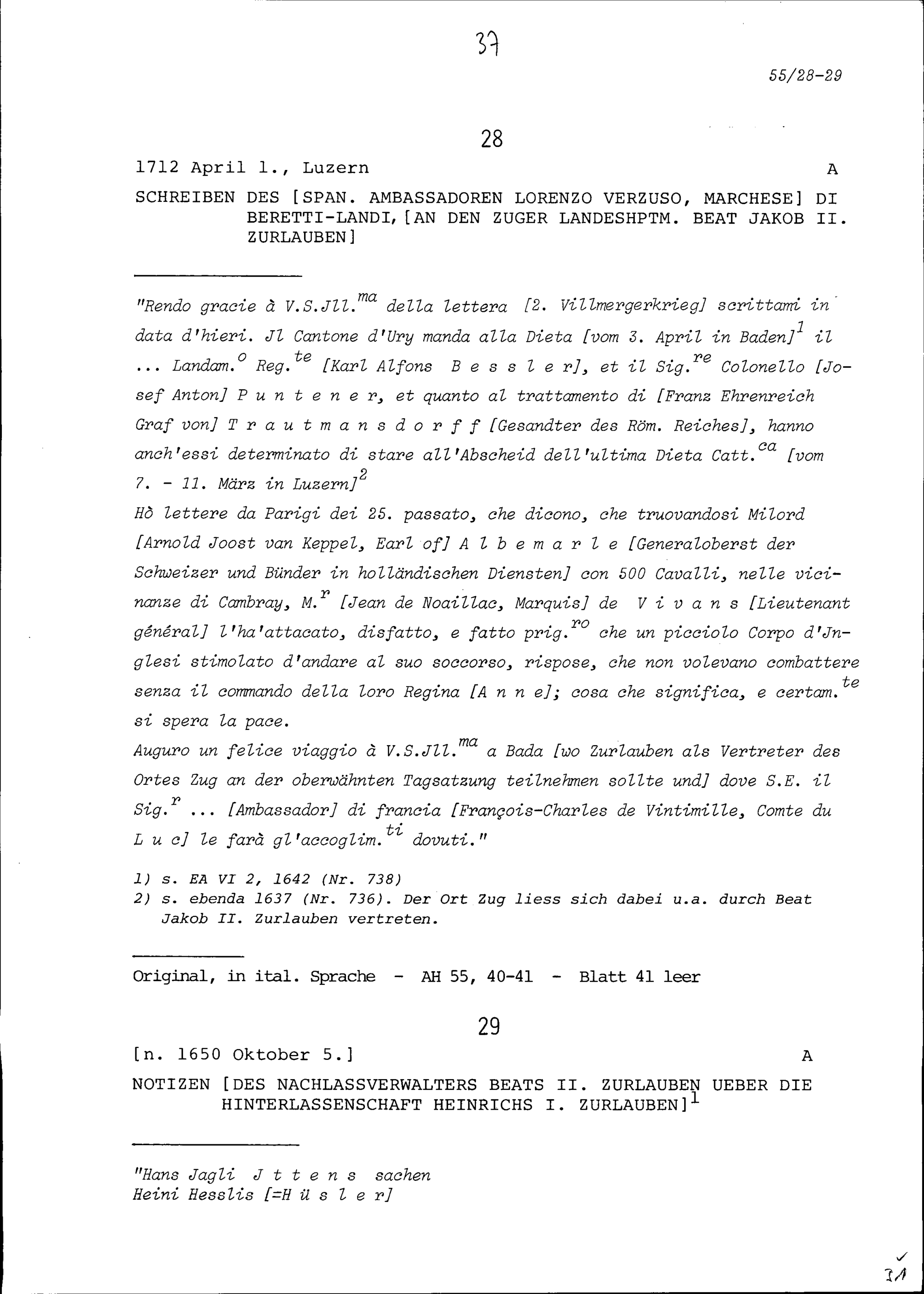 Notiz von Beat II. Zurlauben, Nachlassverwalter, über die Hinterlassenschaft von Heinrich I. Zurlauben