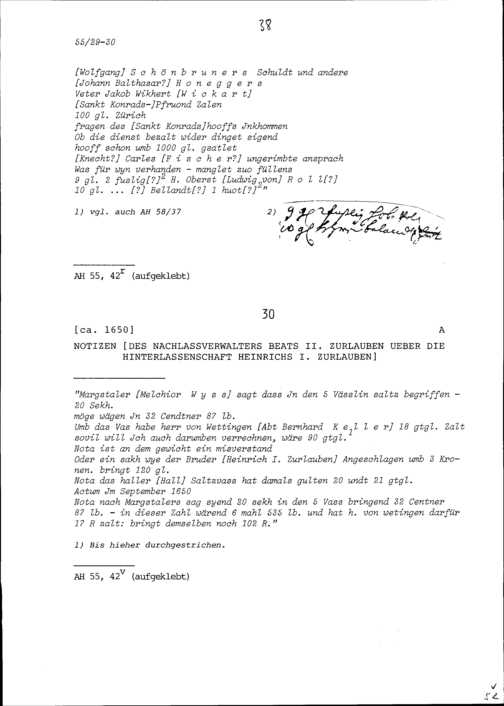 Notiz von Beat II. Zurlauben, Nachlassverwalter, über die Hinterlassenschaft von Heinrich I. Zurlauben