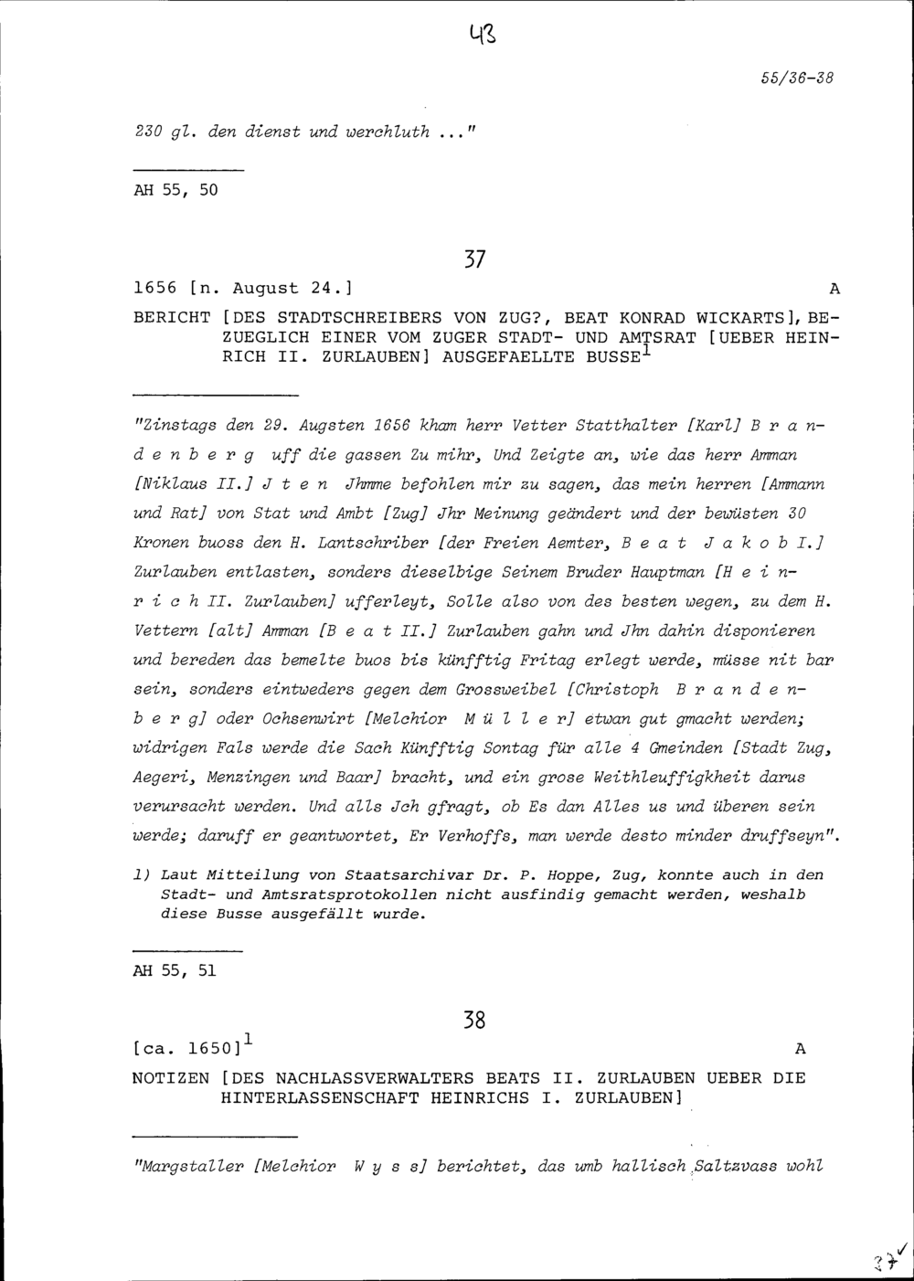 Notiz von Beat II. Zurlauben, Nachlassverwalter, über die Hinterlassenschaft von Heinrich I. Zurlauben