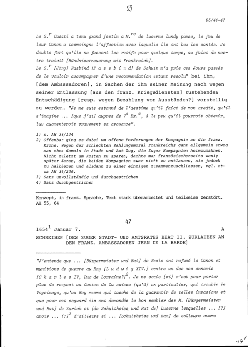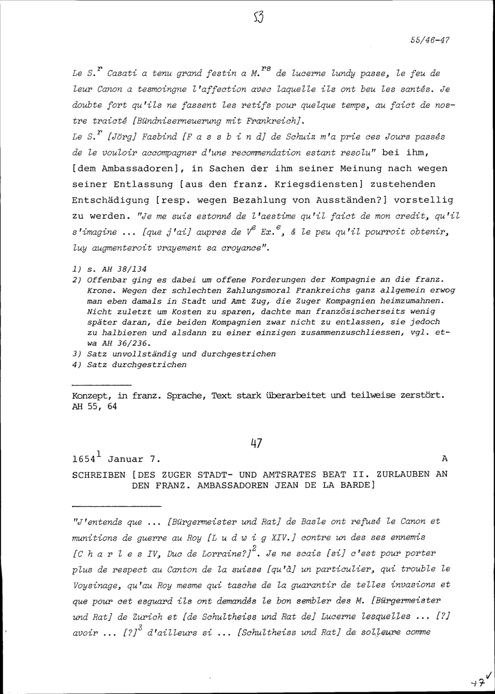 Schreiben von Beat II. Zurlauben, Stadt- und Amtrat Zug, an Jean de la Barde, Ambassador von Frankreich