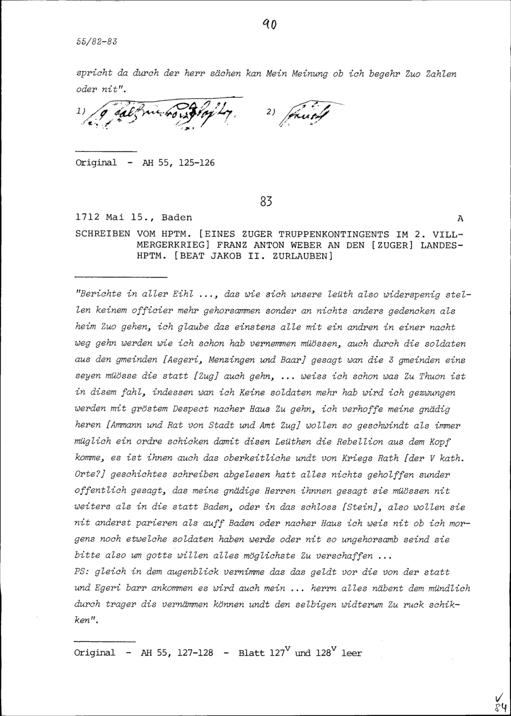 Schreiben von Johann Josef Sidler, Hauptmann, an Beat Jakob II. Zurlauben