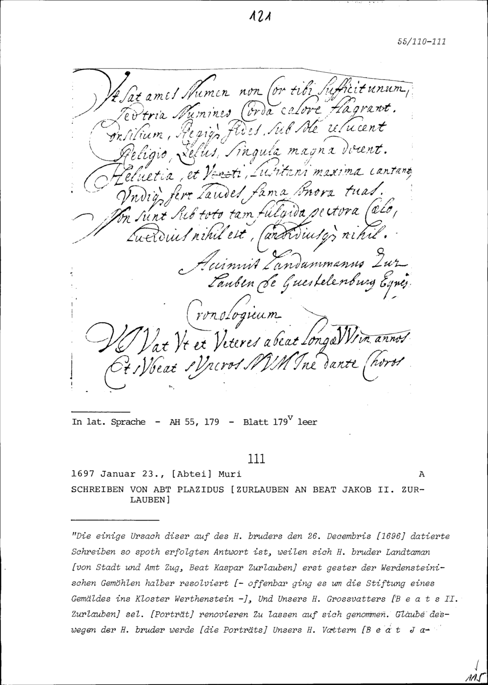 Epigramm und Chronologium von Beat Kaspar Zurlauben, Ammann von Stadt und Amt Zug, zu Ehren von Michel-Jean Amelot, Ambassador von Frankreich