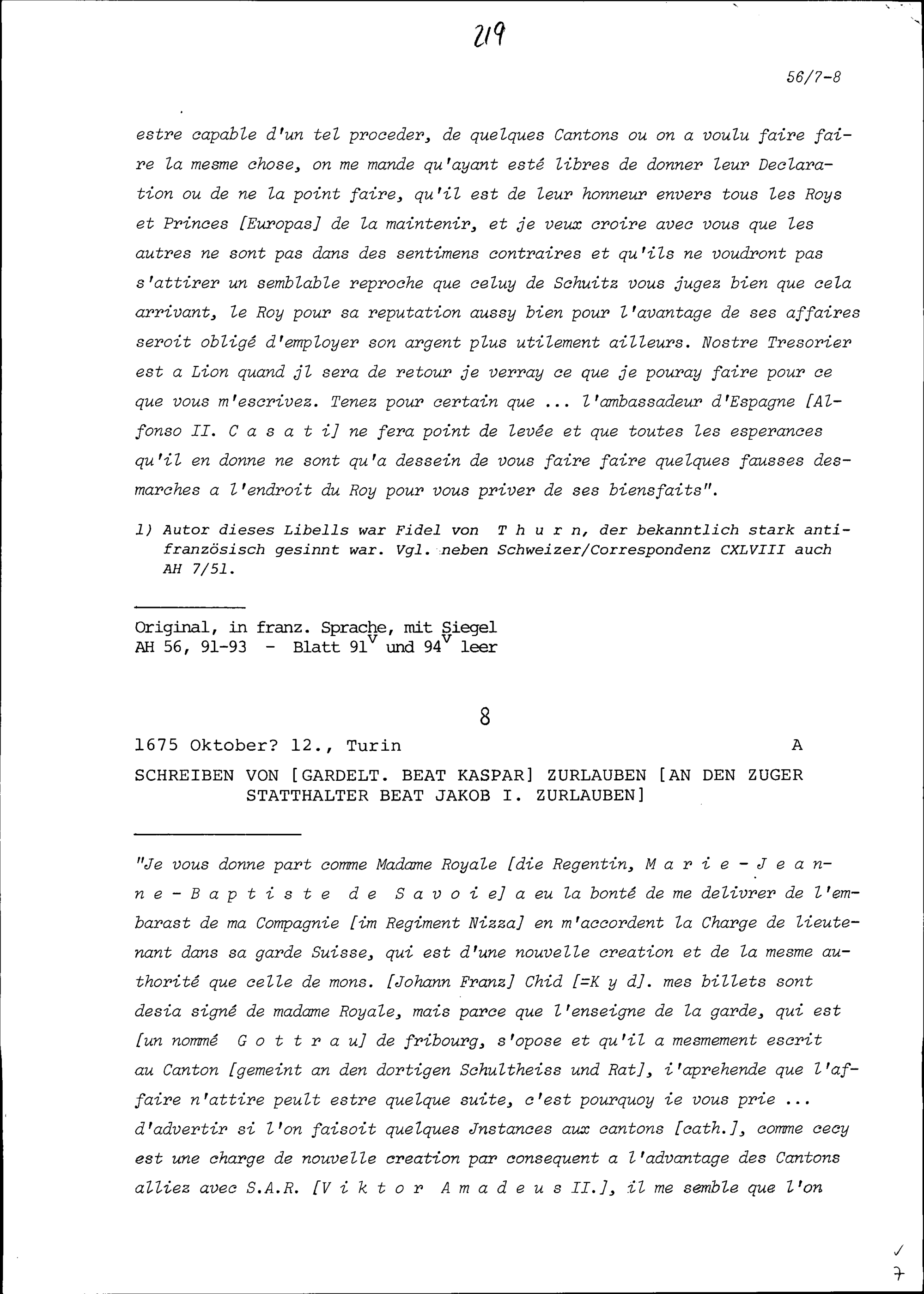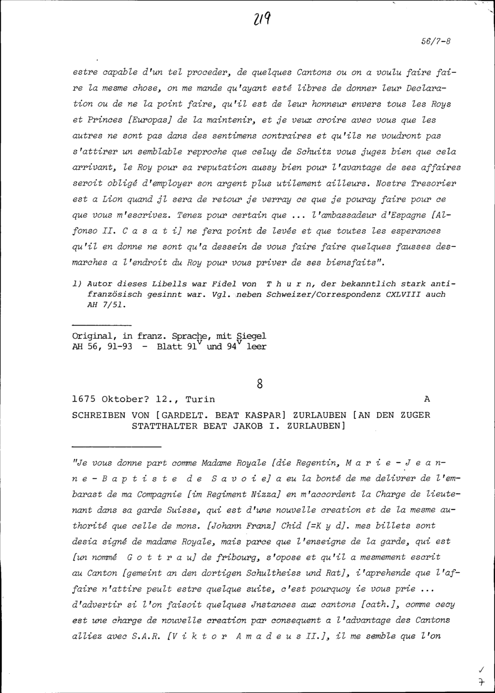 Schreiben von François Mouslier, Resident von Frankreich, an Beat Jakob I. Zurlauben, Statthalter, Zug