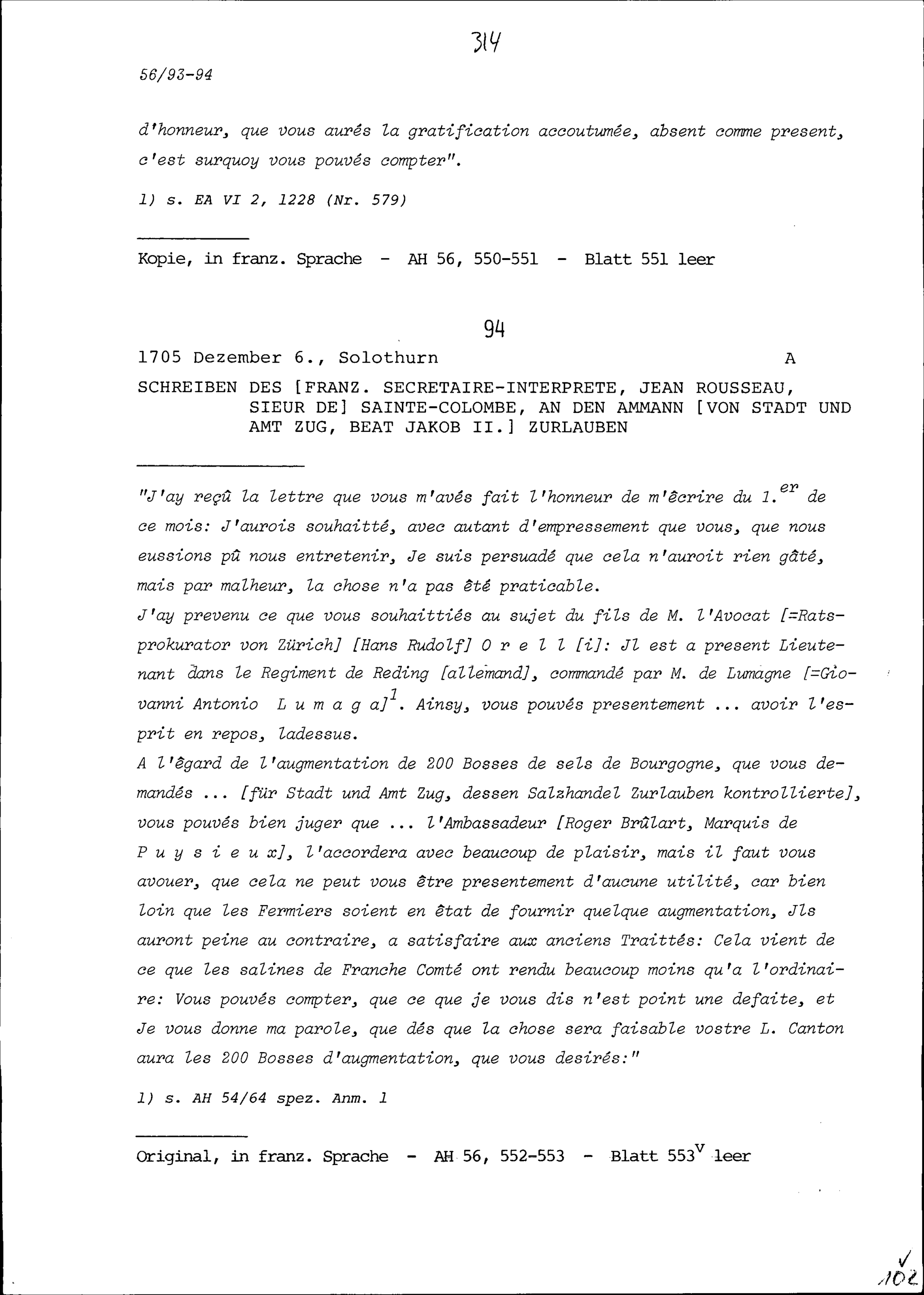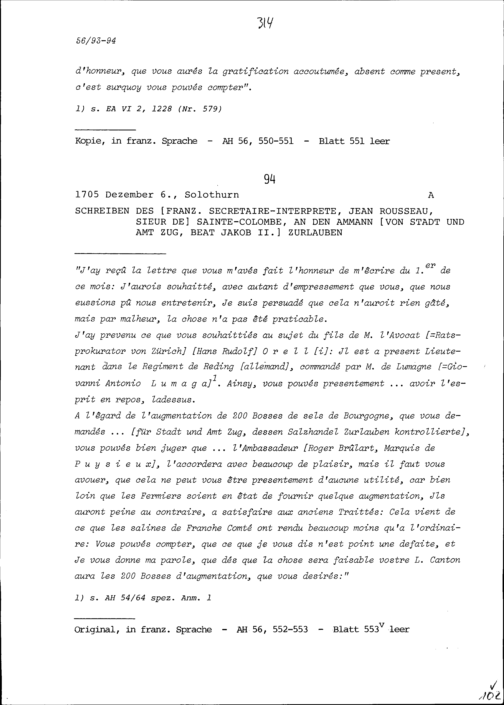Schreiben von Jean Rousseau, Sieur de Sainte-Colombe, Geschäftsträger von Frankreich, an Beat Kaspar Zurlauben, Stadt- und Amtrat Zug