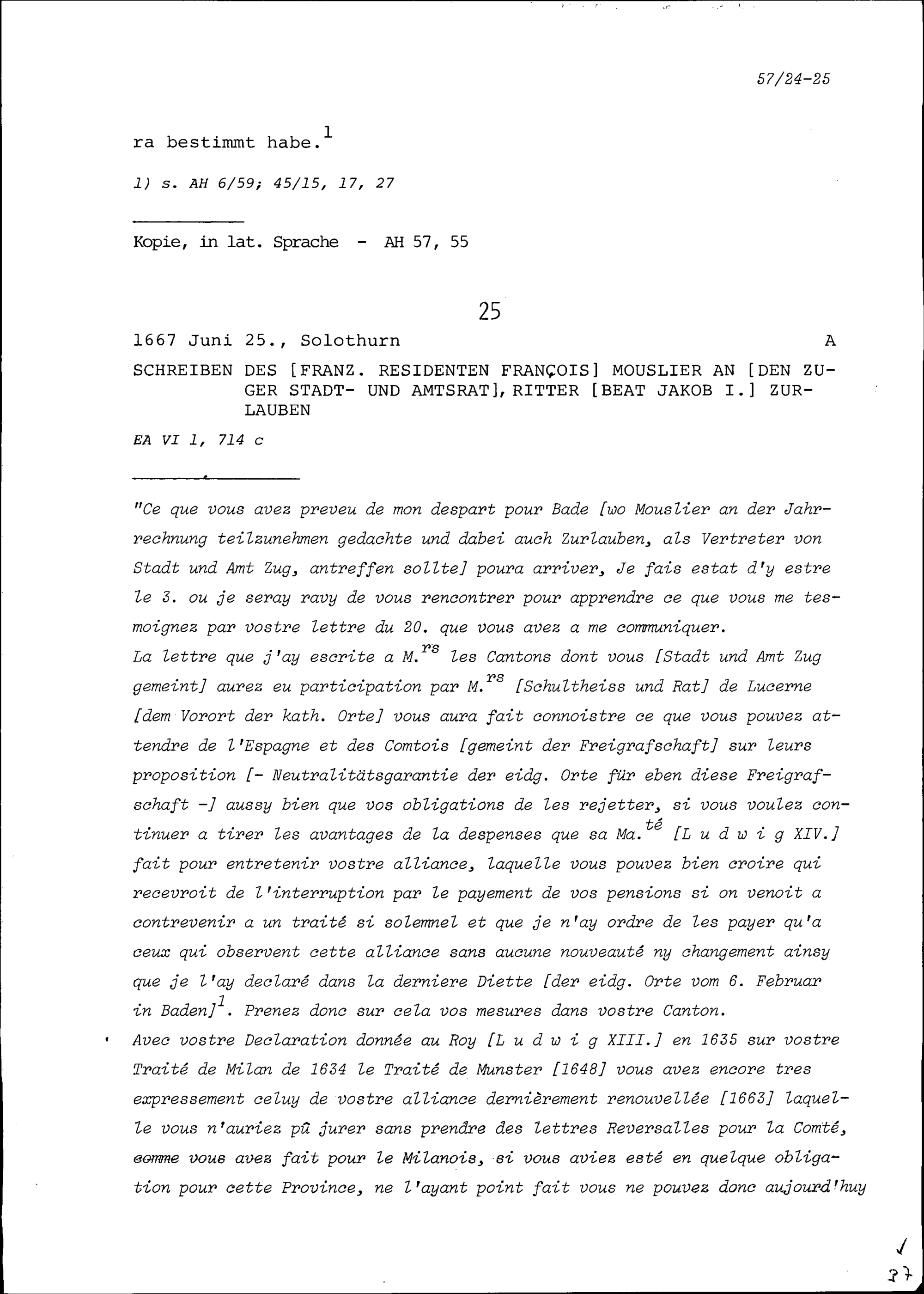 Schreiben des Ammanns und Rats von Stadt und Amt Zug an Innozenz XII., Papst