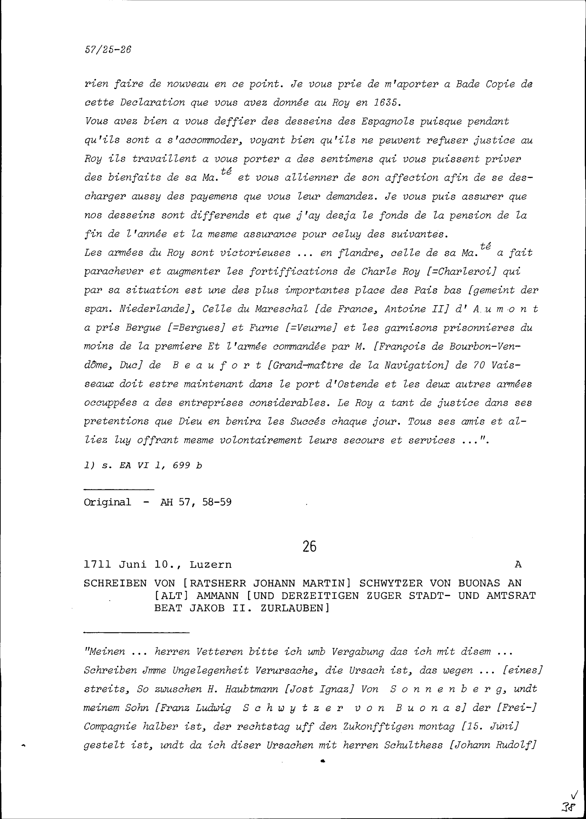 Schreiben von François Mouslier, Resident von Frankreich, an Beat Jakob I. Zurlauben, Stadt- und Amtrat Zug