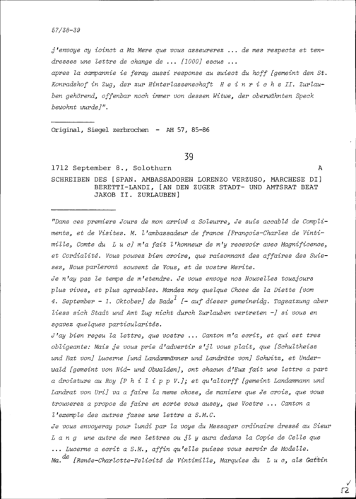 Schreiben von Beat Jakob Zurlauben, Feldmarschall, an Maria Margaretha Pfyffer von Wyer, Witwe von Beat Jakob I. Zurlauben, Luzern