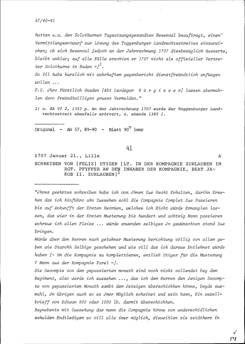 Schreiben von Jost Müller, Dekan, an Beat Jakob II. Zurlauben, Tagsatzungsgesandte von Stadt und Amt Zug in Baden und Altammann