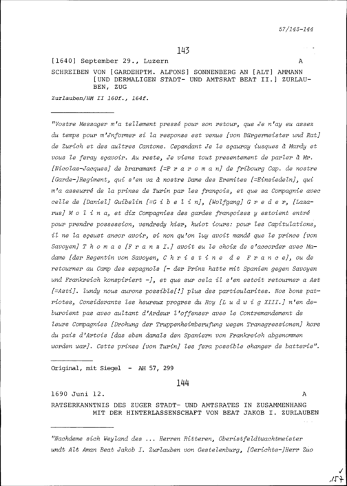 Ratsbeschluss des Stadt- und Amtrats Zug in Zusammenhang mit der Hinterlassenschaft von Beat Jakob I. Zurlauben