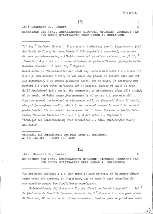 Schreiben von Giovanni Michele Leonardi, Ambassador von Savoyen, an Beat Jakob I. Zurlauben, Statthalter Zug