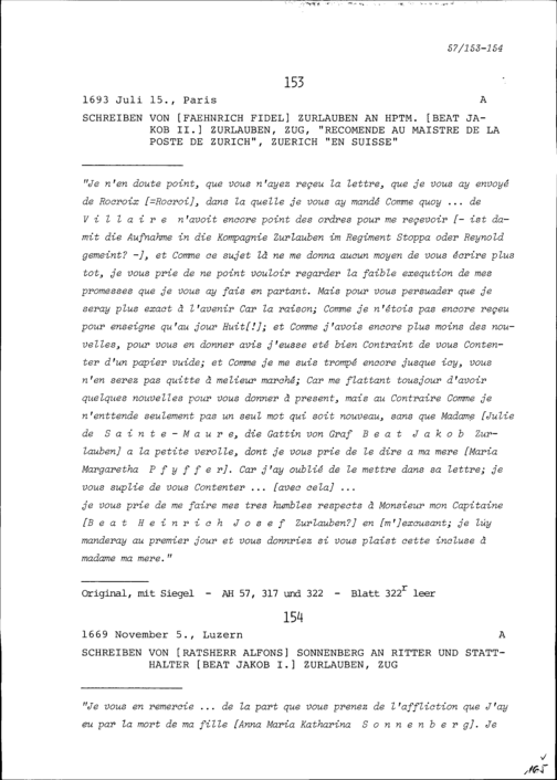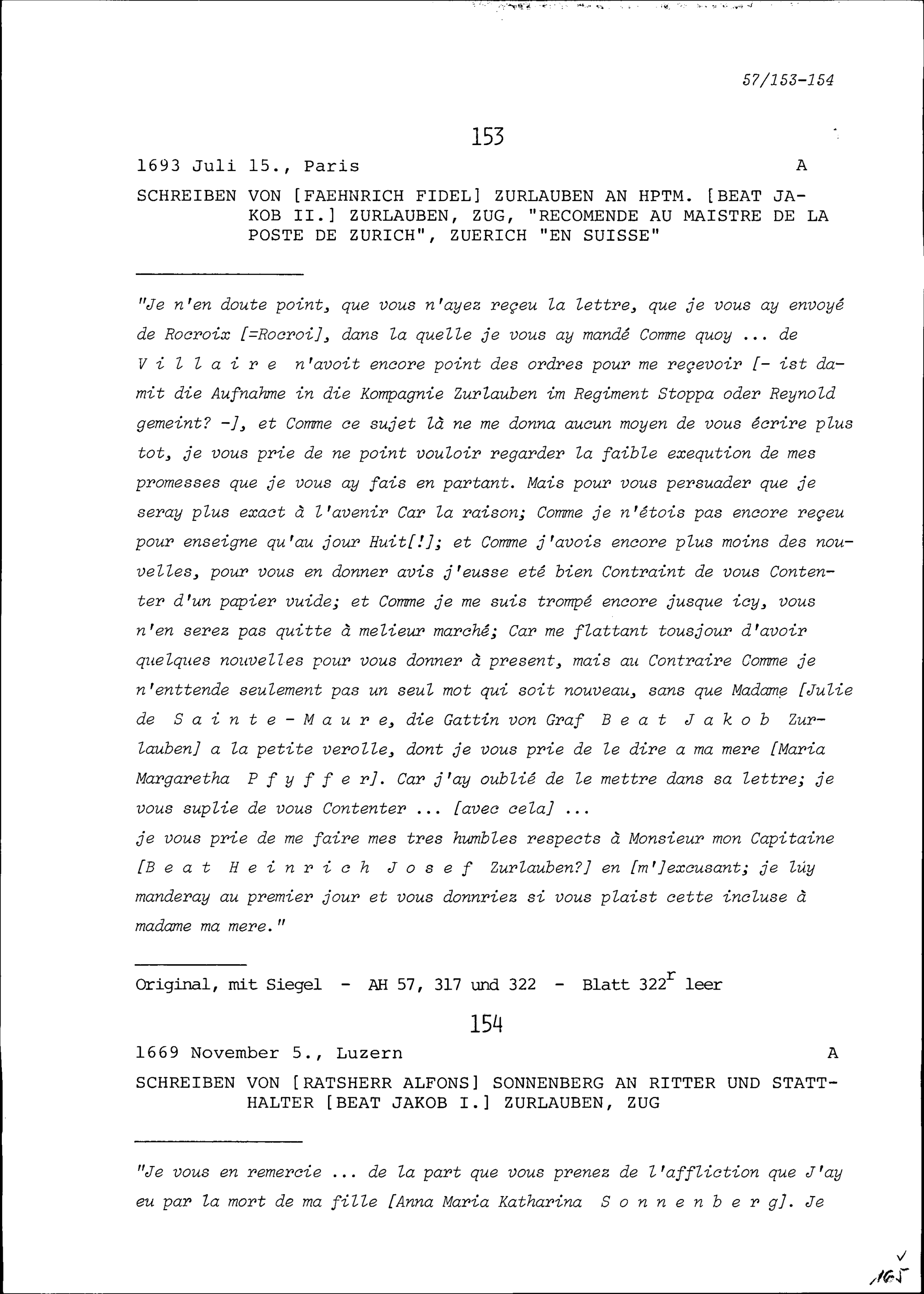 Schreiben von Alfons von Sonnenberg, Ratsherr, an Beat Jakob I. Zurlauben, Statthalter, Zug