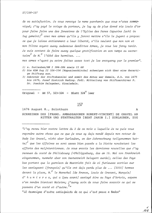 Schreiben von Robert-Vincent de Gravel, Ambassador von Frankreich, an Beat Jakob I. Zurlauben, Statthalter Zug