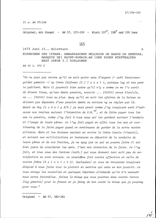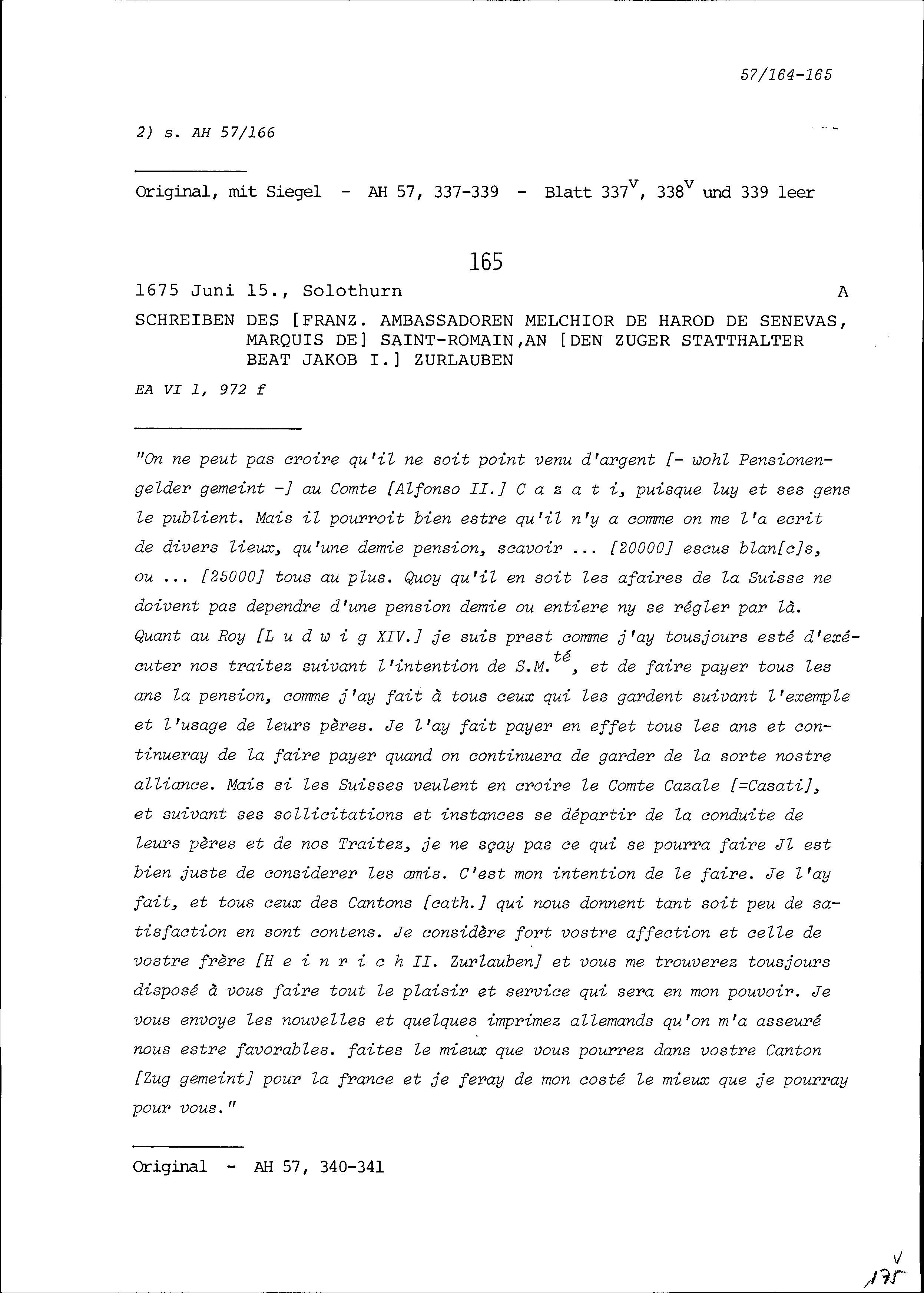 Schreiben von Michel Baron, Dolmetscher, an Beat Jakob I. Zurlauben, Statthalter, Zug