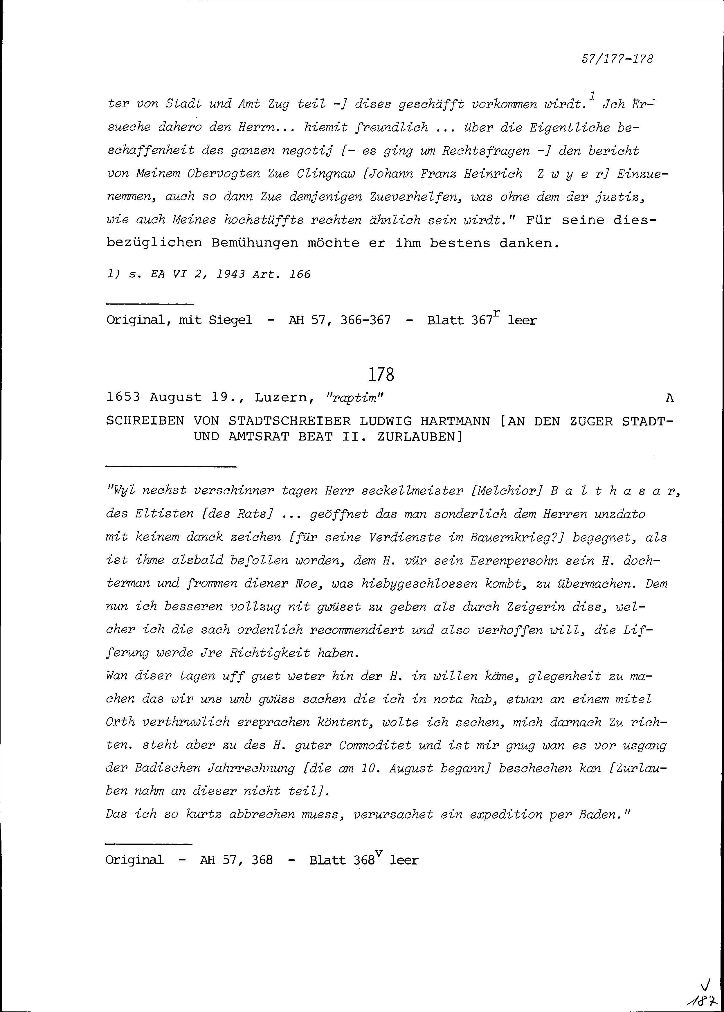 Schreiben von Johann Franz Schenk von Stauffenberg, Bischof, an Beat Jakob II. Zurlauben, Stadt- und Amtrat Hauptmann, Altammann und Oberstfeldwachtmeister, Zug