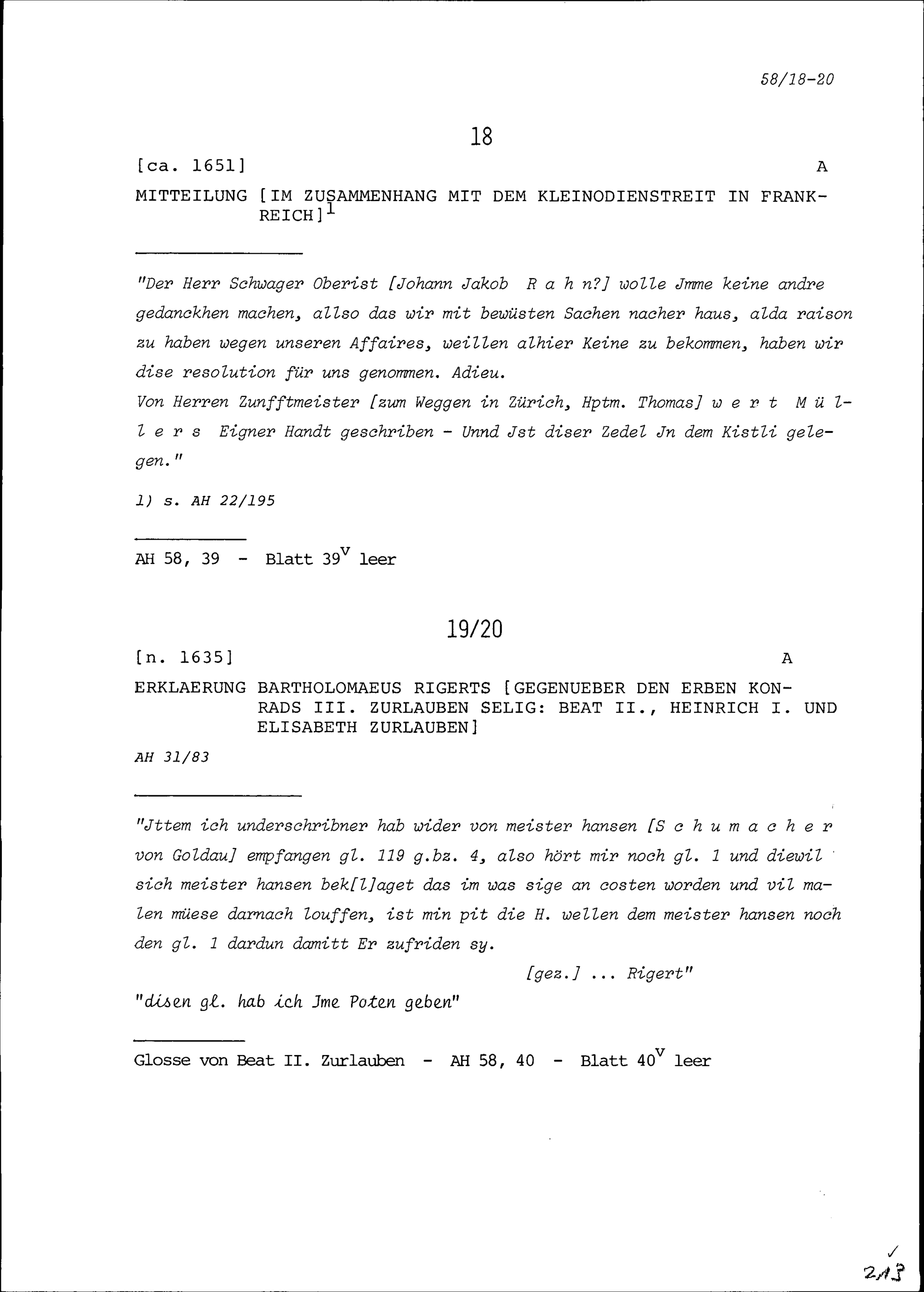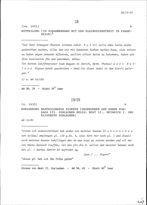 Erklärung von Bartholomäus Rigert gegenüber den Erben von Konrad III. Zurlauben:...