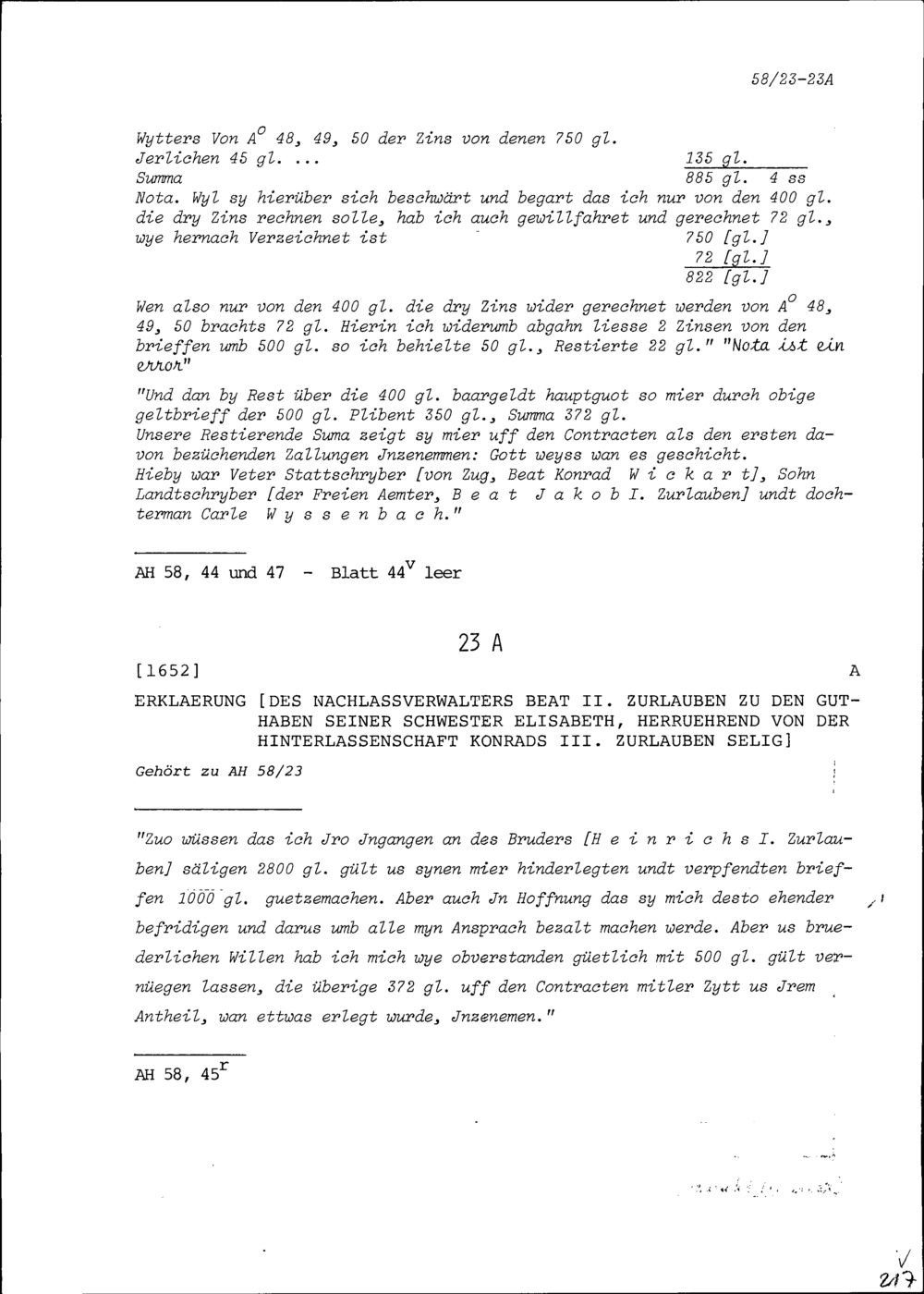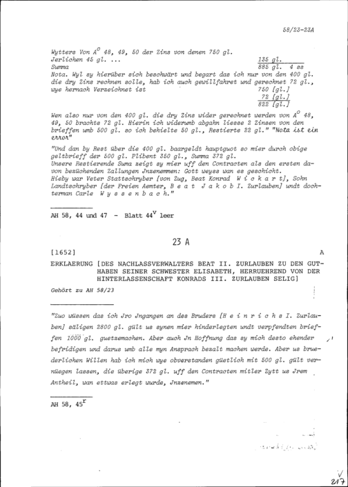 Abrechnung von Beat II. Zurlauben über die Guthaben beziehungsweise Schulden seiner Schwester Elisabeth Zurlauben, herrührend aus der Hinterlassenschaft von Konrad III. Zurlauben