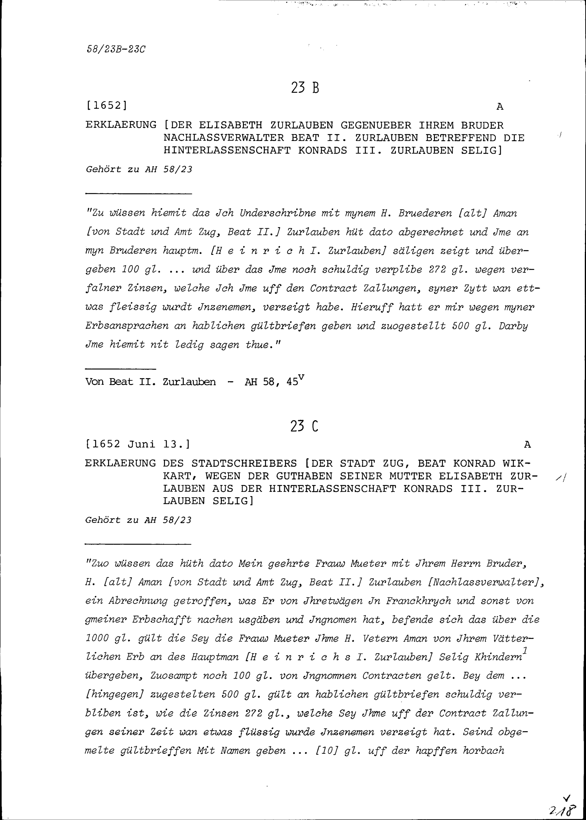 Erklärung von Beat Konrad Wickart, Stadtschreiber der Stadt Zug, wegen der Guthaben seiner Mutter Elisabeth Zurlauben aus der Hinterlassenschaft von Konrad III. Zurlauben