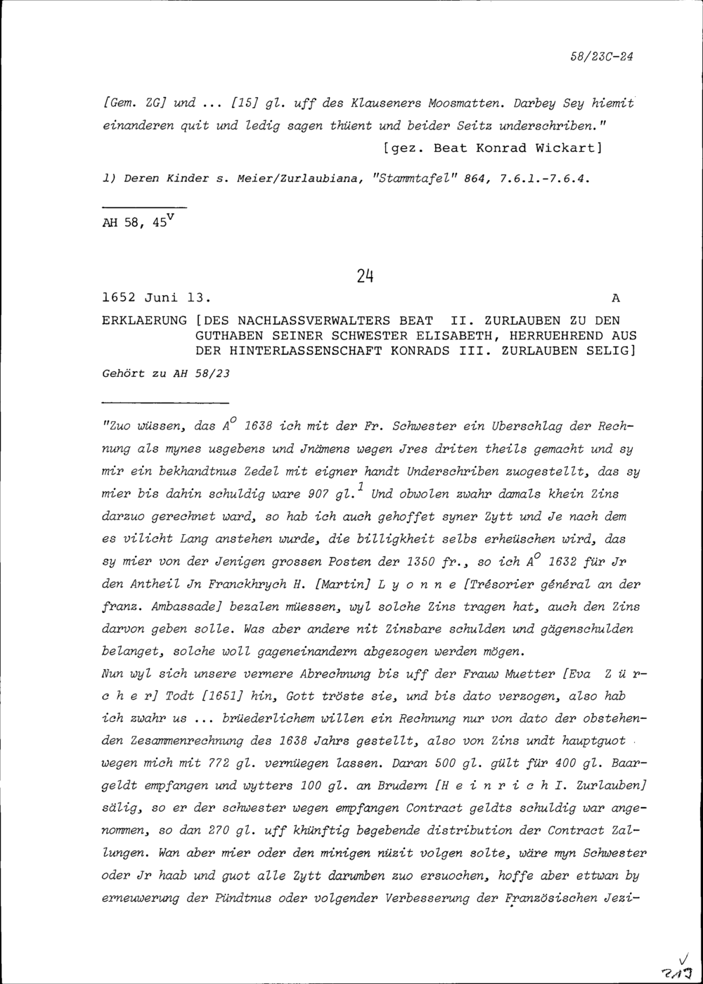 Erklärung von Beat Konrad Wickart, Stadtschreiber der Stadt Zug, wegen der Guthaben seiner Mutter Elisabeth Zurlauben aus der Hinterlassenschaft von Konrad III. Zurlauben