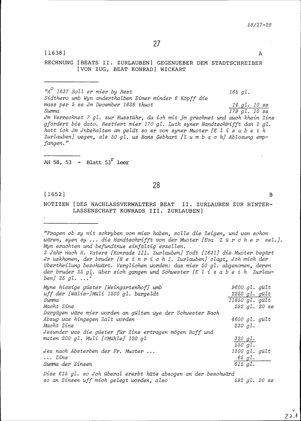Notiz von Beat II. Zurlauben, Nachlassverwalter, zur Hinterlassenschaft von Konrad III. Zurlauben