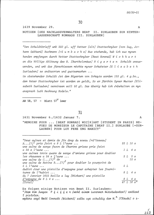Notiz für Beat Konrad Wickart, Student in Paris, Neffe von Beat II. Zurlauben, Hauptmann
