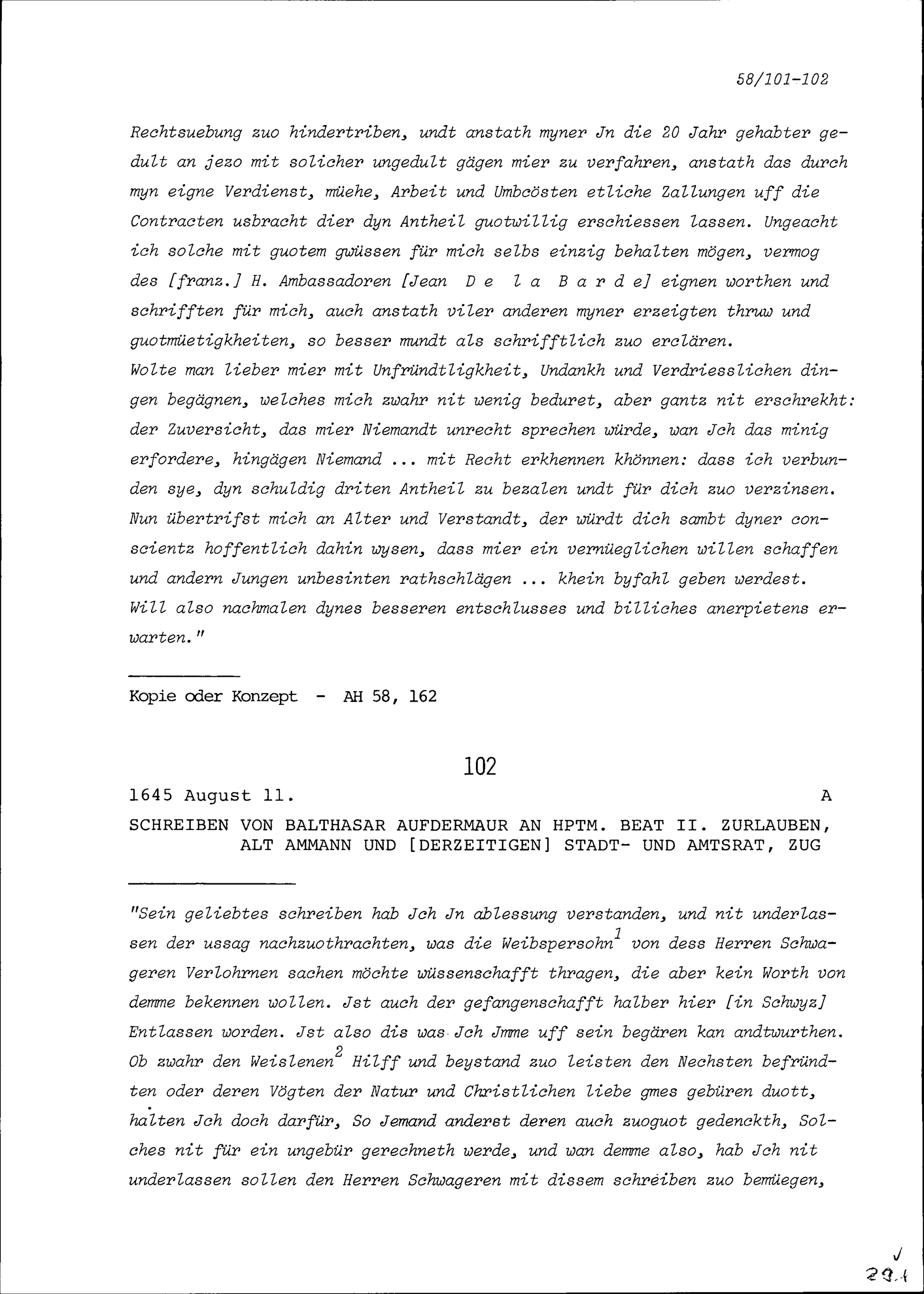 Schreiben von Beat II. Zurlauben an Elisabeth Zurlauben