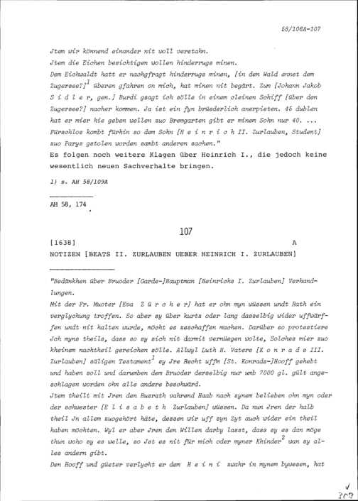 Notiz von Beat II. Zurlauben über Heinrich I. Zurlauben