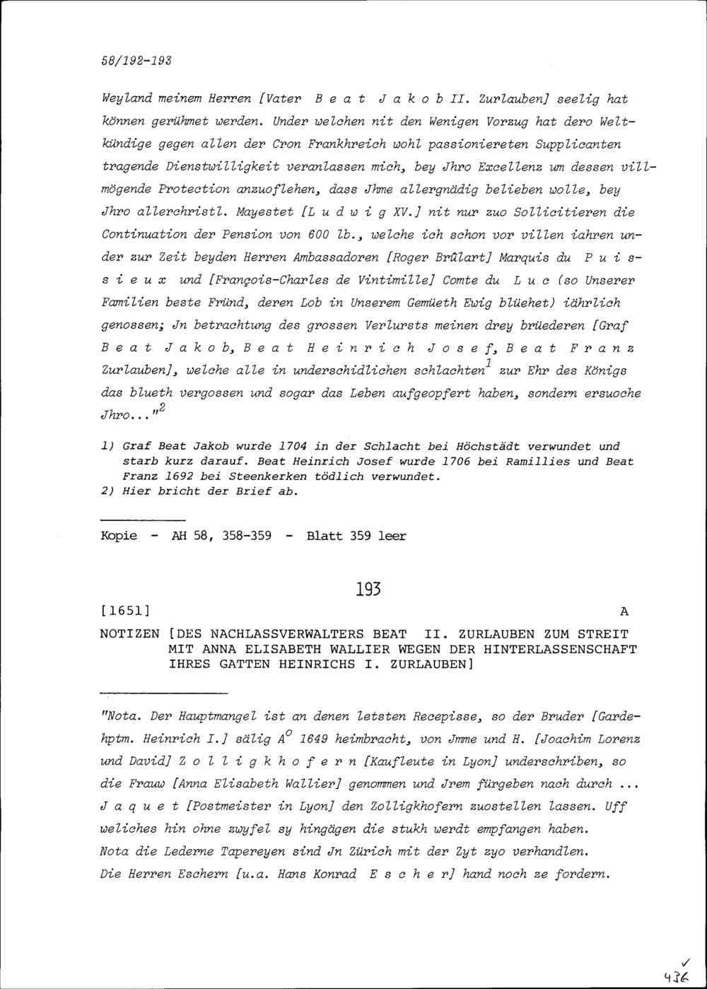 Schreiben von Beat Jakob Anton Zurlauben an Claude-Théophile de Béziade, Marquis d'Avaray, Ambassador von Frankreich