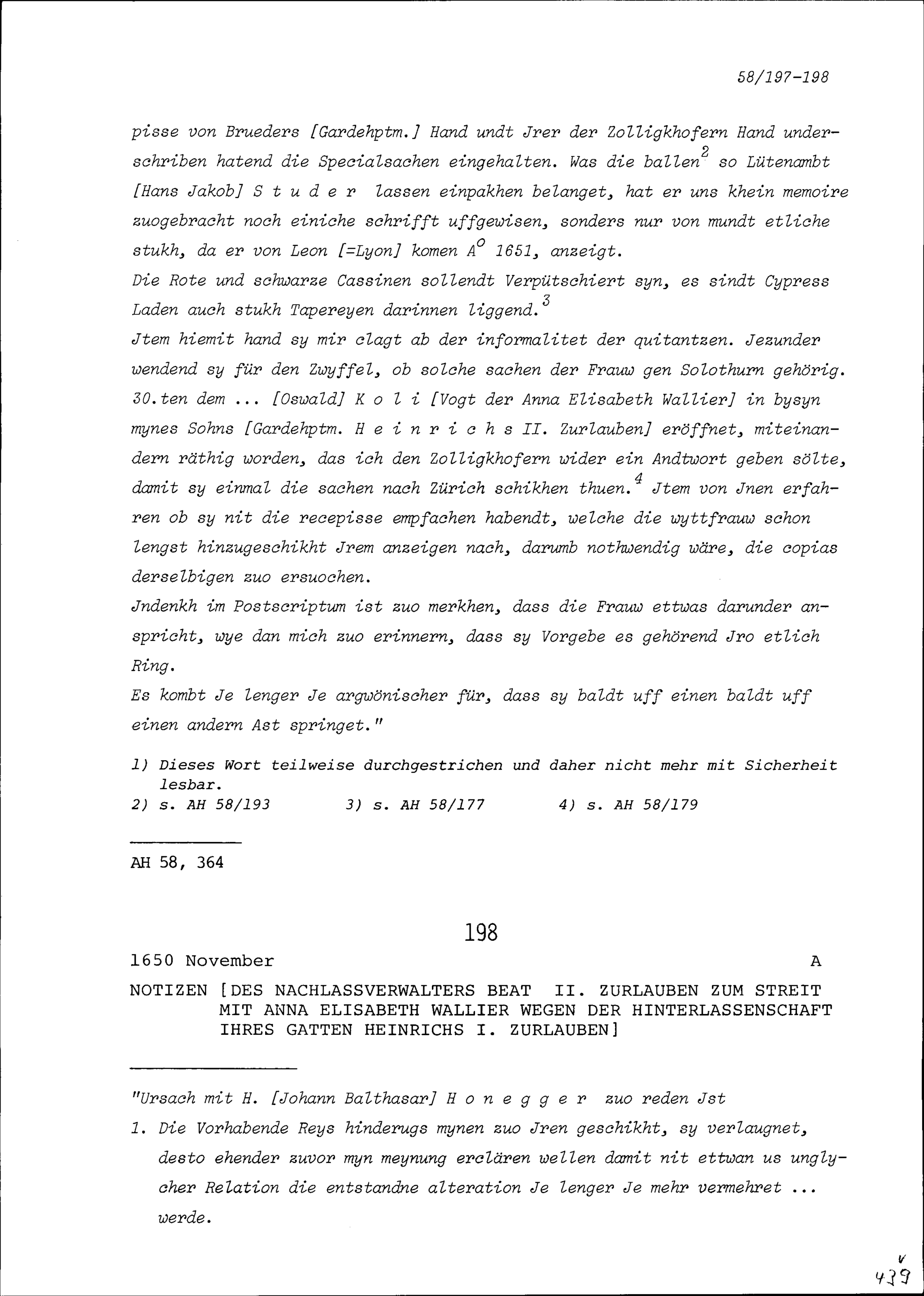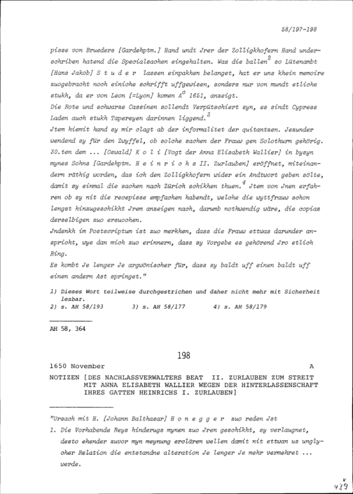 Notiz von Beat II. Zurlauben, Nachlassverwalter, zum Streit mit Anna Elisabeth Wallier wegen der Hinterlassenschaft Heinrich I. Zurlauben