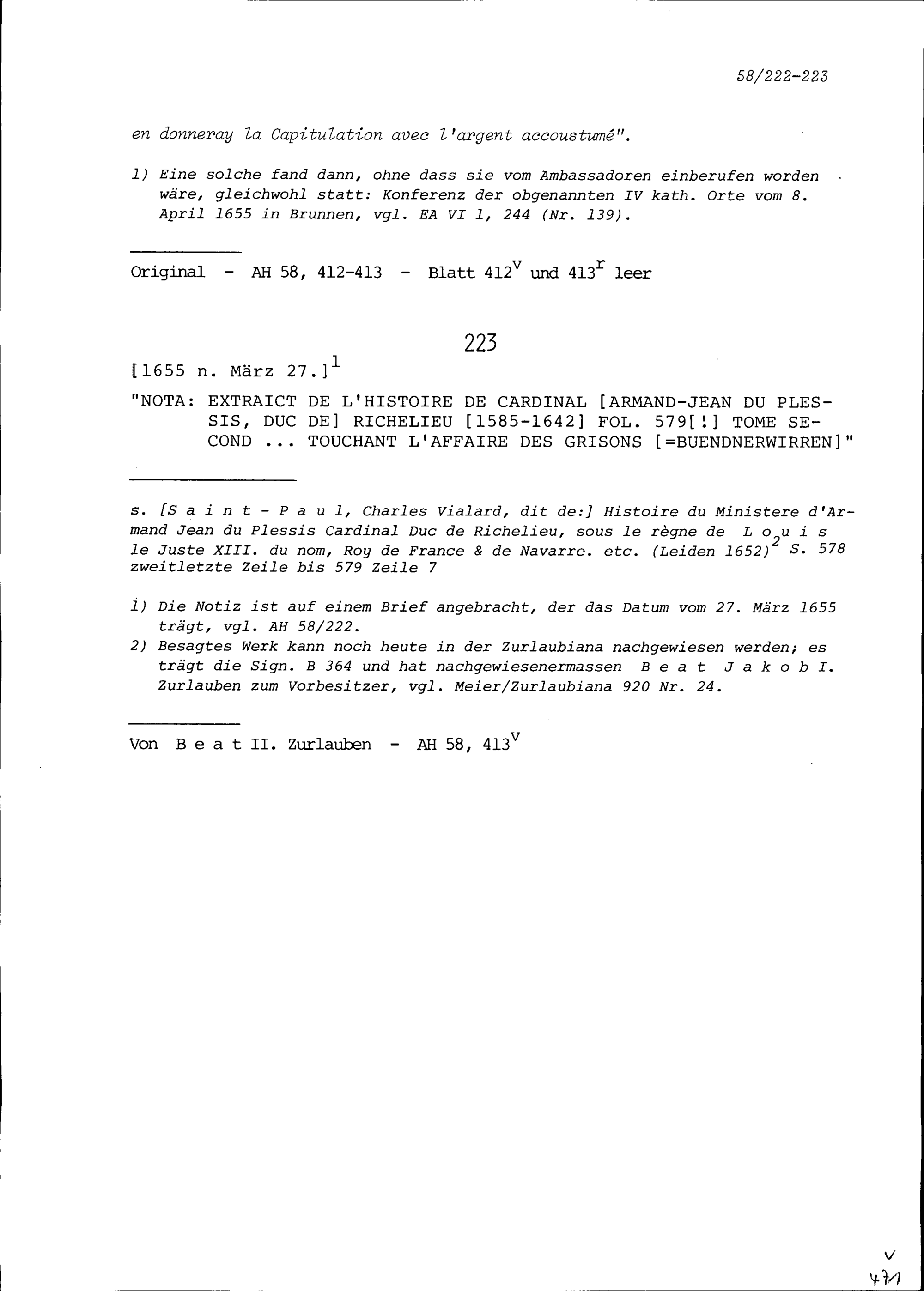 Schreiben von Jean de la Barde, Ambassador von Frankreich, an Beat II. Zurlauben,...