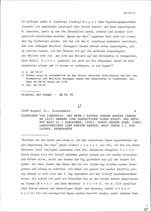 Schreiben von Beat II. Zurlauben, Stadt- und Amtrat Zug, an Beat Jakob I. Zurlauben, Landschreiber der Freien Ämter, Bremgarten