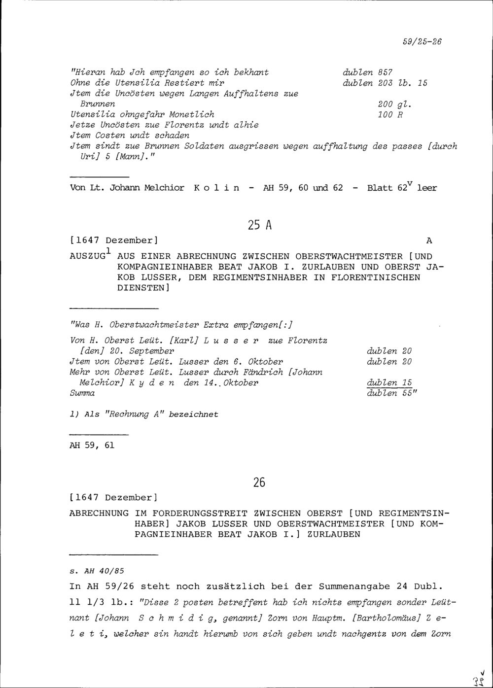 Abrechnung im Forderungsstreit zwischen Jakob Lusser, Oberst und Regimentsinhaber, und Beat Jakob I. Zurlauben, Oberstwachtmeister und Kompanieinhaber