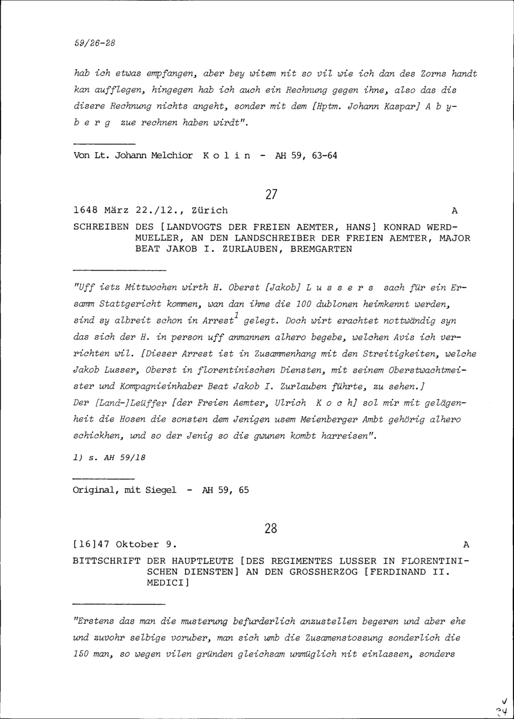 Bittschrift der Hauptleute des Regiments Lusser in florentinischen Diensten an Ferdinand II. Medici, Grossherzog