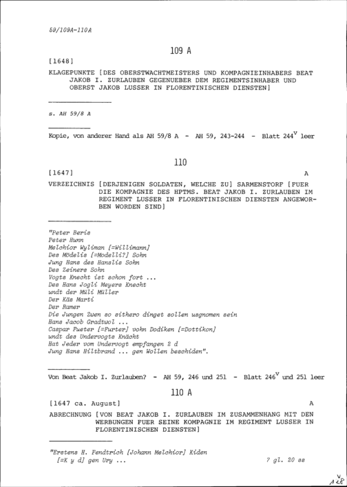 Soldaten, welche zu Sarmenstorf für die Kompanie von Beat Jakob I. Zurlauben, Hauptmann im Regiment Lusser in florentinischen Diensten, angeworben worden sind
