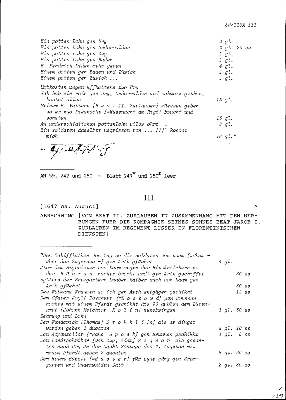 Abrechnung von Beat Jakob I. Zurlauben in Zusammenhang mit den Werbungen für seine Kompanie im Regiment Lusser in florentinischen Diensten